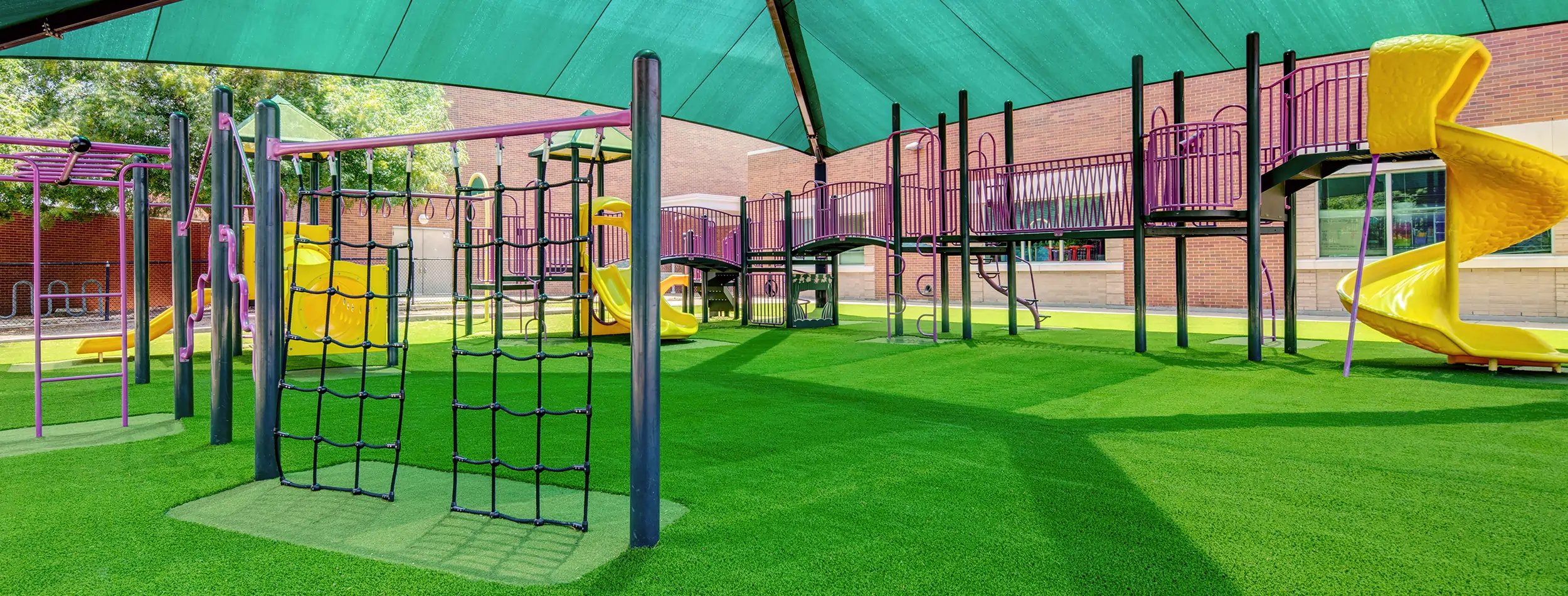 A: Yes. Playground turf systems maintain their vibrant appearance year-round, resisting weather-related fade, mud, and bare spots. Unlike natural grass, synthetic turf doesn’t rely on sun or water to stay lush and inviting.